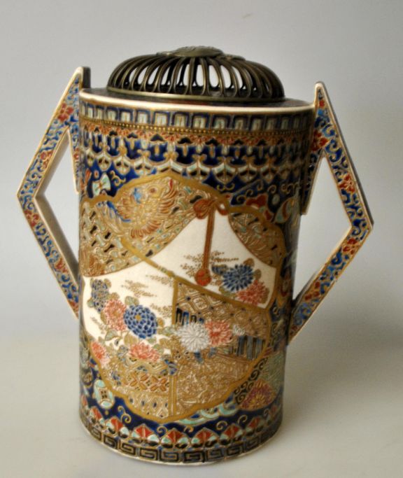 Japansk Satsuma fajance koro - røgelses brænder, 19. årh. Enestående arbejde med talrige håndmalede dekorationer i form af mønstre, terasser med nedrullede gardiner, fugle og blomster. Med talrige forgyldninger. Special håndtag. Metal låg med gennembrydninger med dekorationer af blomster. Signeret og stemplet. H.: 19 cm.