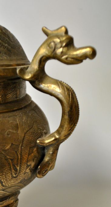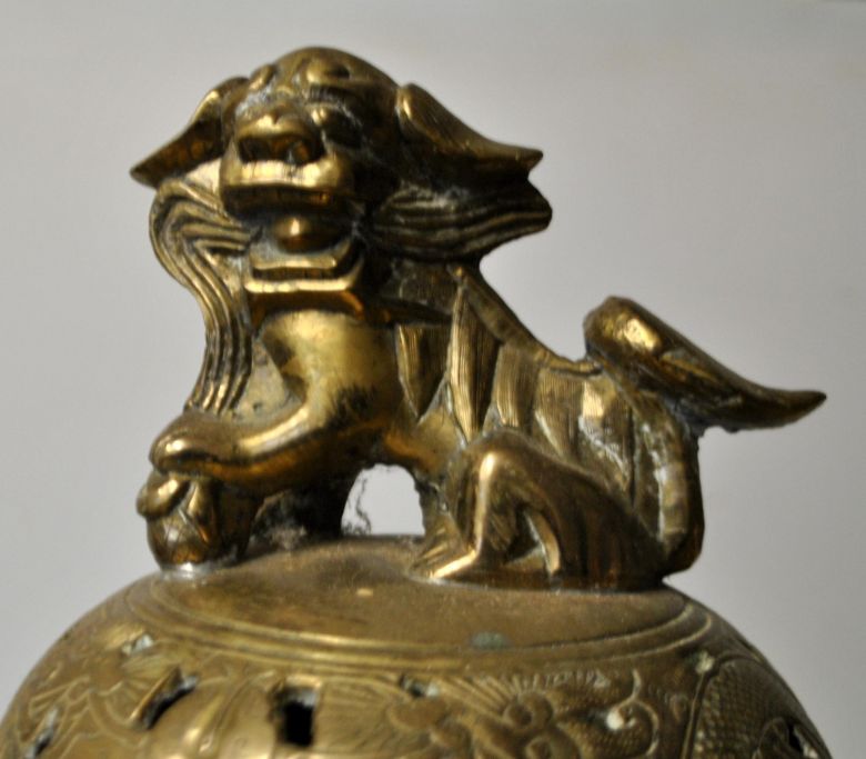 Kinesisk røgelseskrukke i bronze på tre ben, 19. årh. Med to ører; gennembrudt låg med dekoration i form af løve. På korpus dekoreret med drage og blomster. H.: 32 cm. B.: 25 cm. Stemplet.