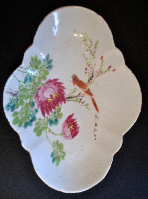 Kinesisk porcelænsskål, 19. årh. Håndbemalet med blomster og fugl. 8 kantet. L.: 27,5 cm. B.: 20 cm.