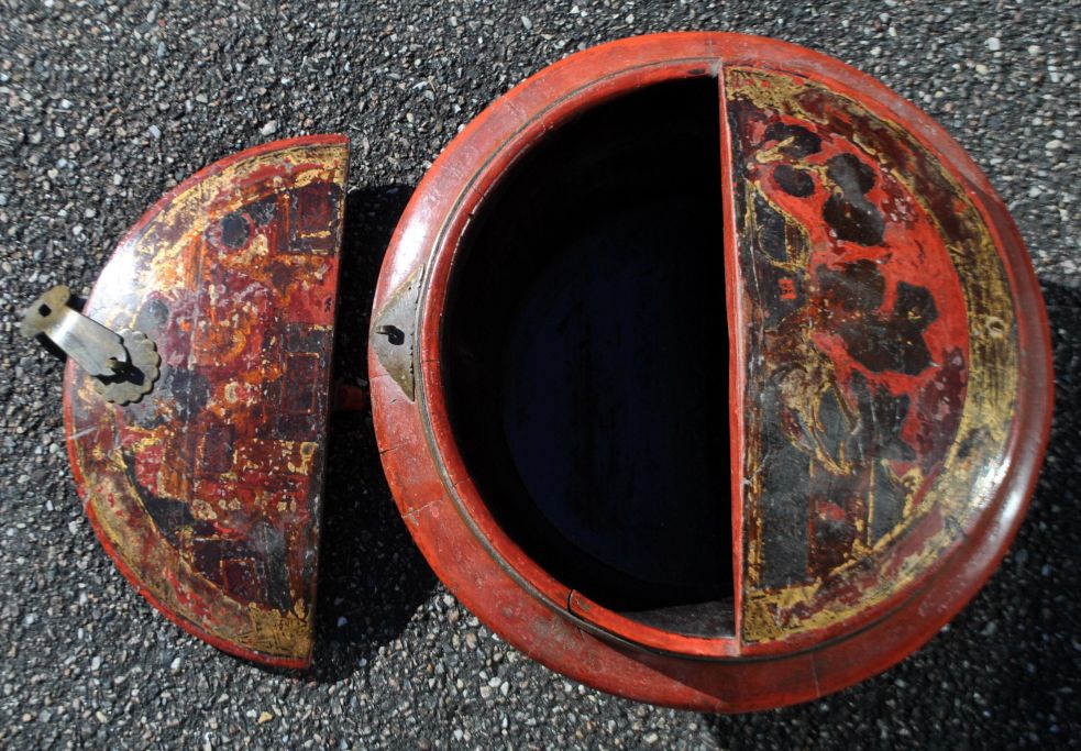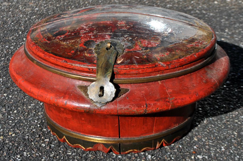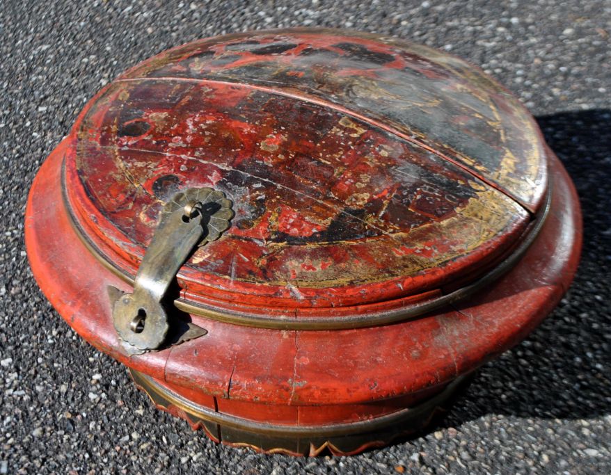 Kinesisk beholder i lakeret træ, 19. årh. Rødlakeret træ med forgyldninger. Messing beslag. Halvdelen af låget kan tages helt af. H: 19 cm. Dia: 35 cm.