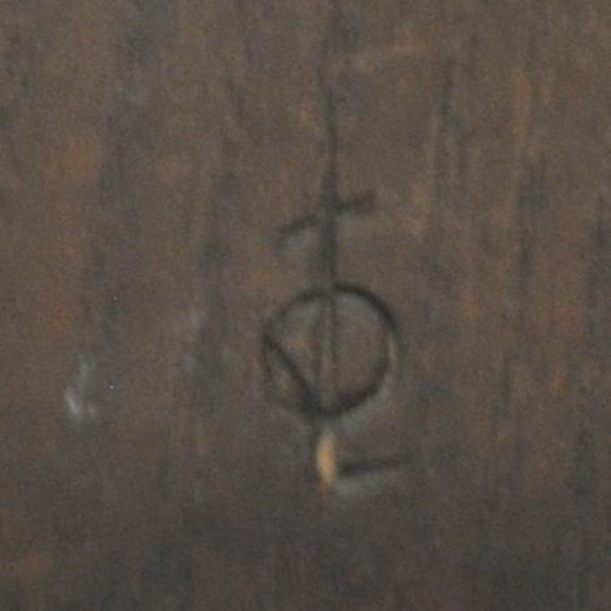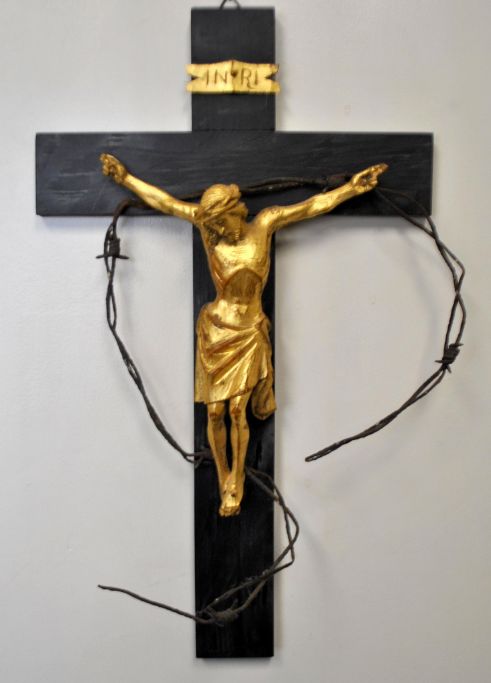 Forgyldt træfigur, Kristus på korset, 20. årh. Håndskåret. Figur ophæng på sortmalet kors med pigtråd. Signeret. H.: 41 cm. B: 24,5 cm.
