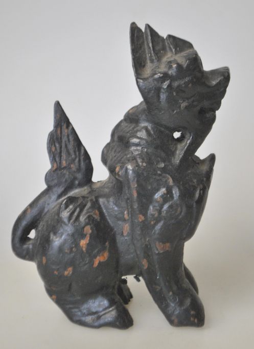 Kinesisk udskåret træfigur af løve, 19. årh. Sortbemalet. H.: 12 cm.