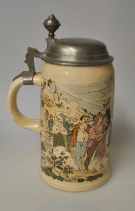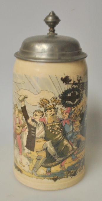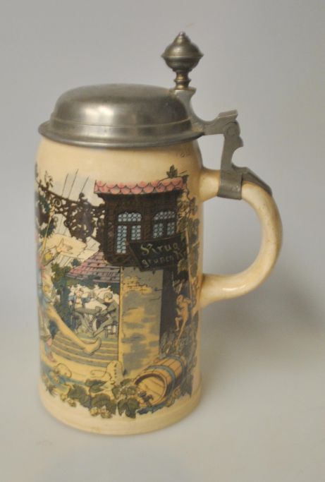 Tysk fajance krus med tinlåg 1909. Dekoration i overføringsteknik med optog. H.: 21,5 cm.