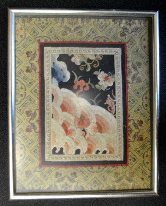 Kinesisk silkebroderi, 19. årh. Dekoration i form af blomster. 26,5 x 20,5 cm.