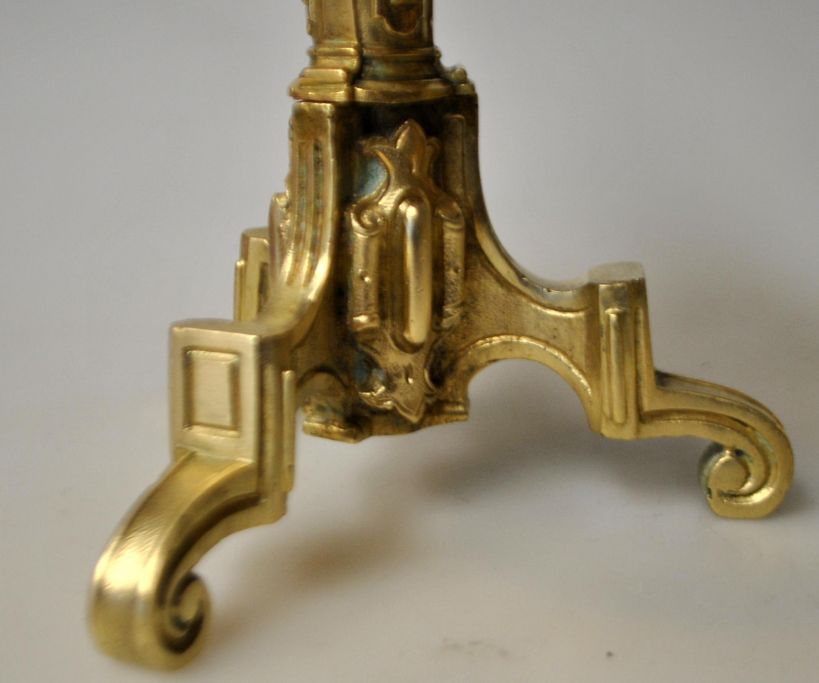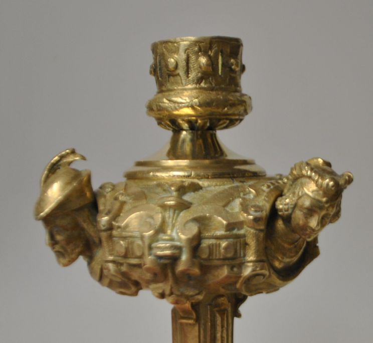 Par franske bronze stager, 19. årh. Med dekorationer i form af ansigter. På tre ben. H.: 17 cm.