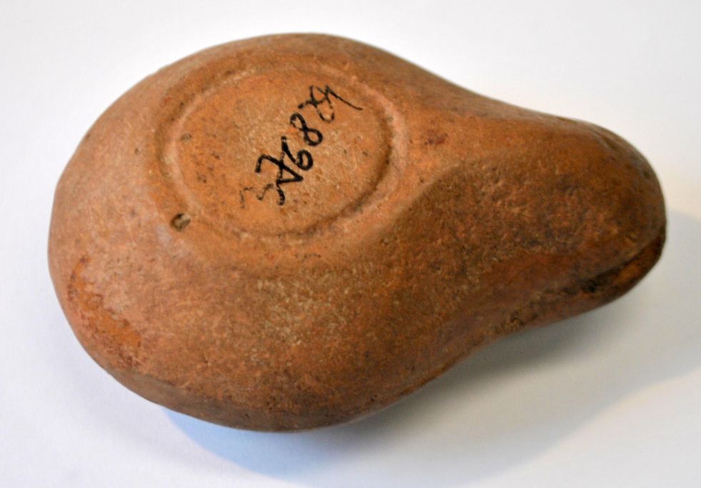 Antik romersk olielampe. Oldtid. Rødler. Med dekorationer på oversiden. L.: 8 cm.