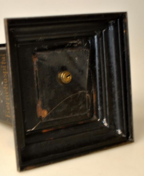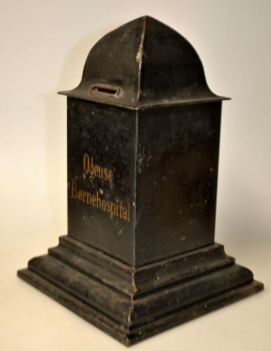 Indsamlings bøsse for Odense Børnehospital, 19. årh. Danmark. Sortbemalet jernblik. Guldbemalet tekst. Med lås i bunden. Højde: 24 cm. På firkantet fod: 16 x 16 cm.