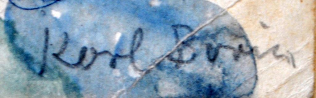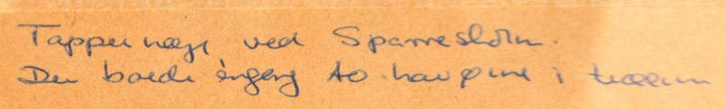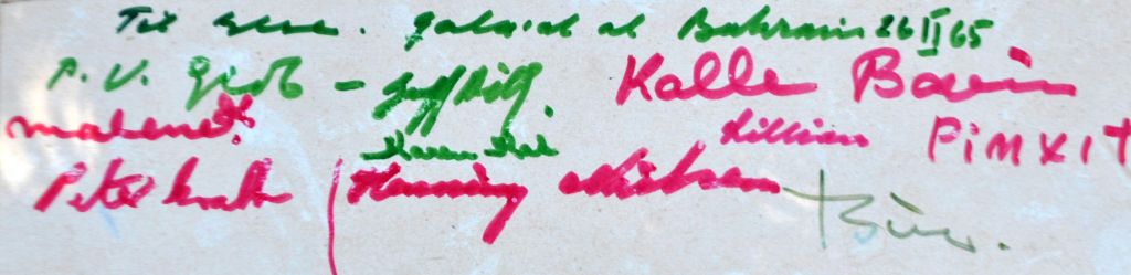 Verso teksten: Til Else - Qala'at al Bahrain 26 II 65 - og alle givernes egenhændige underskrifter: Kalle Bovin (pinxit), P. V. Glob, Geoffrey Bibby (medleder af ekspeditionerne till Golfen. Oprindelig engelsk arkæolog, bosat i Aarhus), Malene (dengang Malene Møller Jensen - nu Malene Ravn, arkitektstuderende og udgraver), Karen Kat (Karen Frifeldt, arkæolog og en af skspiditionernes garvede deltagere. Blev somme tider kaldt Karen Kat), Lilliana (gift med Bue, "husmoder" for ekspeditionen, Peter Crabb (arkæolog), Henning Nielsen (arkæolog - muligvis studerende) og Bue (gift med Lillian, fulde navn Svend Bue Madsen, amatørarkæolog fra Nordsjælland, del af ekspeditionen).