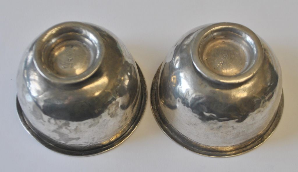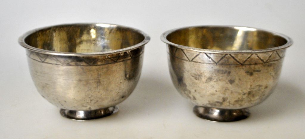 Par svenske sølvbægre, Peter Neiindorff, Lidköping (1797 - 1835). På standrand. Med dekorationer på kumme. Stemplet. H.: 4 cm. Dia.: 6 cm.