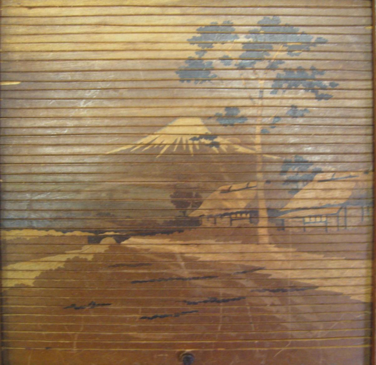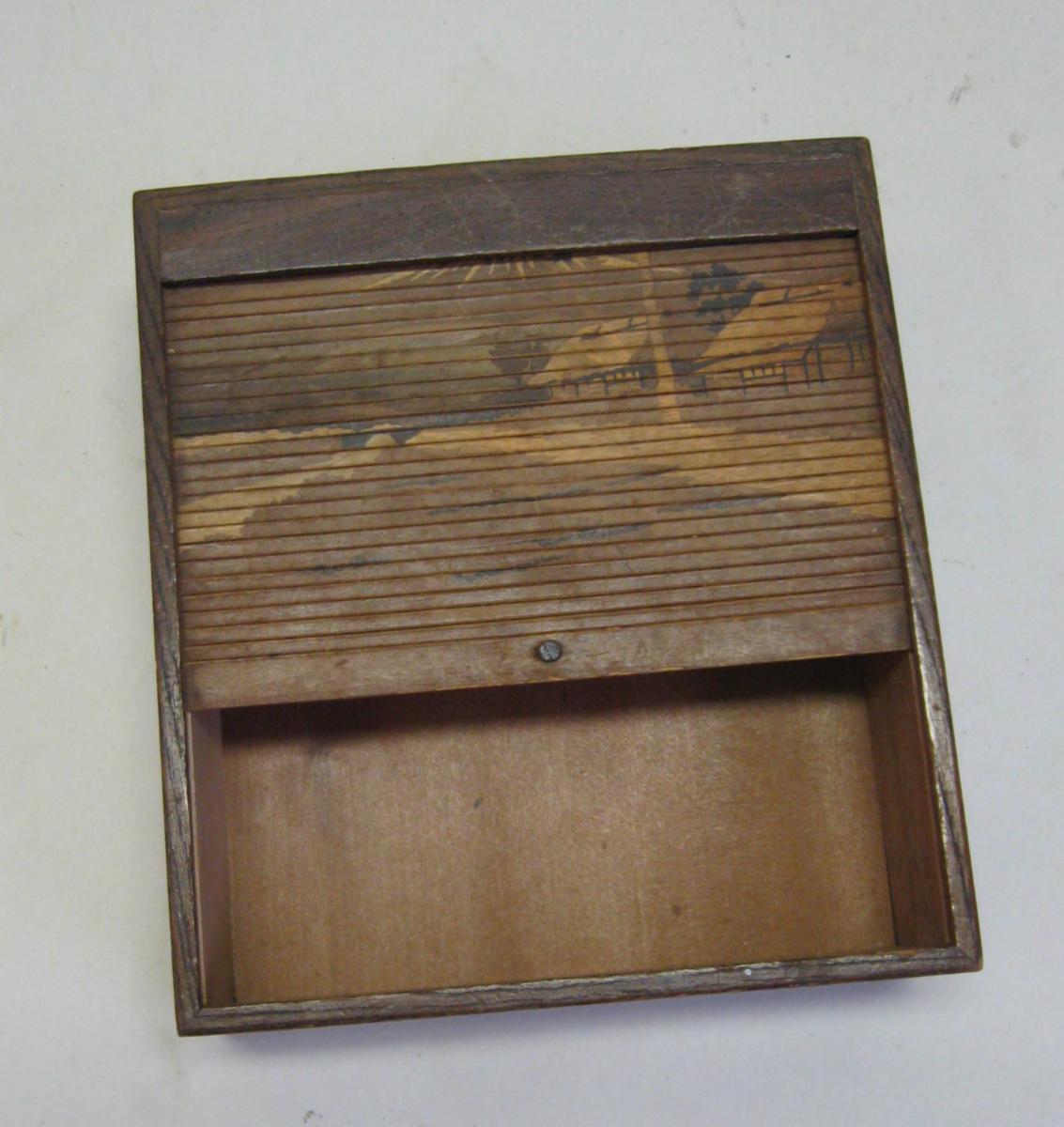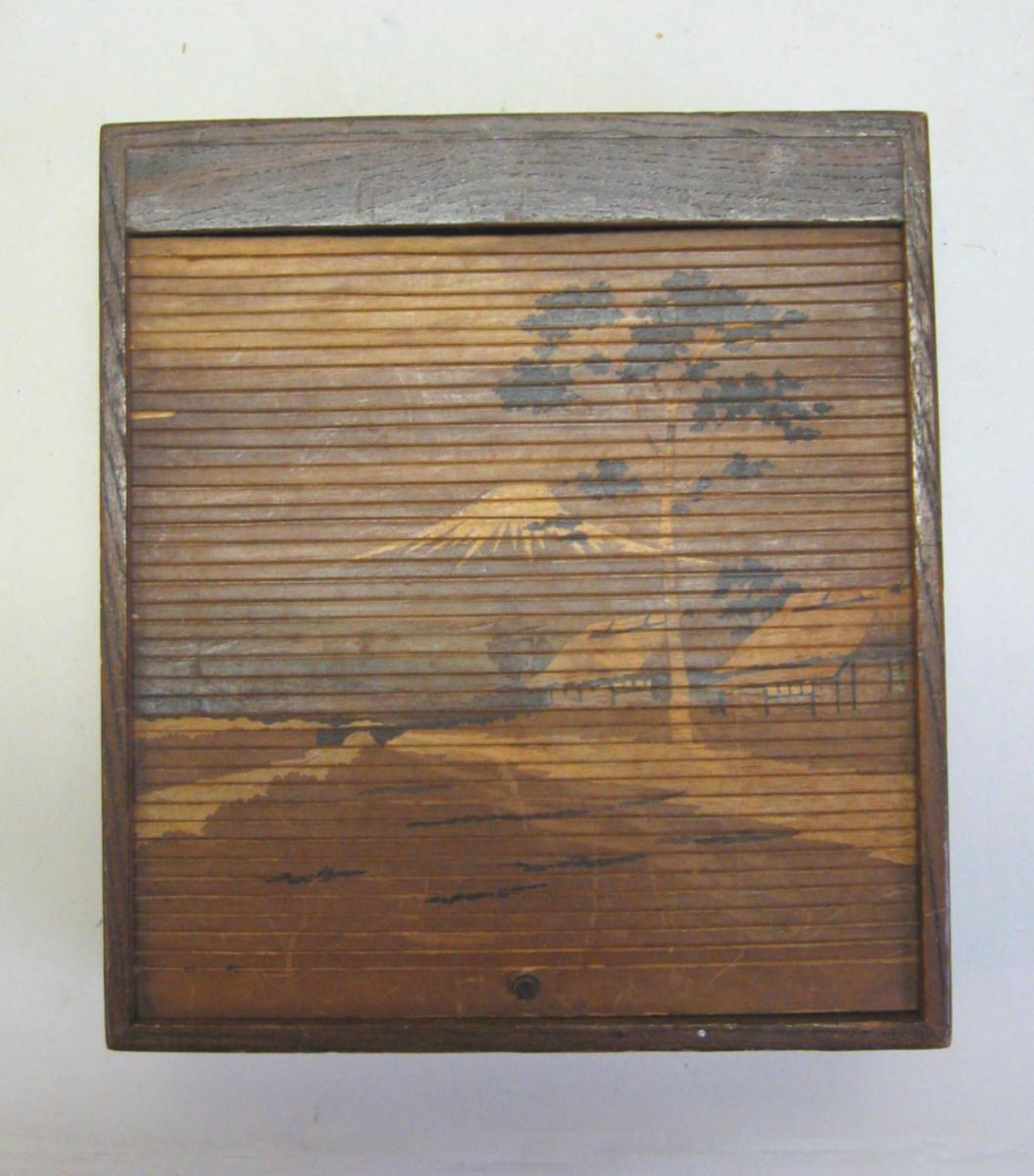 Japansk skrin, ca. 1900, i mørkt træ med indlæg på siderne i form af bladværk. Låg som jalousi, med indgraverede motiver af landskab bl.a. med Futijama. H.: 19,6 cm. B.: 17,5 cm. D.: 6,5 cm.