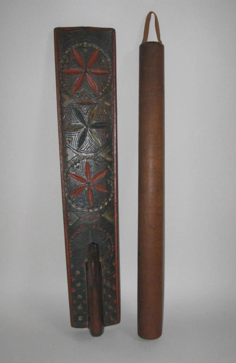 Dansk karvskåret og bemalet manglebræt med rulle, 19. årh.