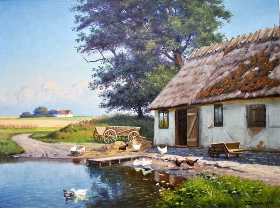 Drews, Kai, (1884 - 1964), Danmark: Høns og ænder ved en dam.
