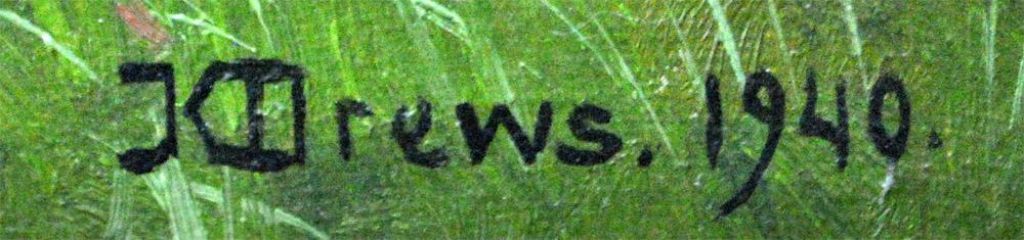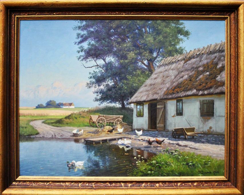 Drews, Kai, (1884 - 1964), Danmark: Høns og ænder ved en dam. Olie på lærred. Signeret: K. Drews 1940. 50 x 65 cm.