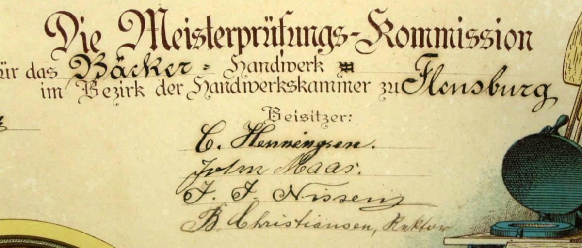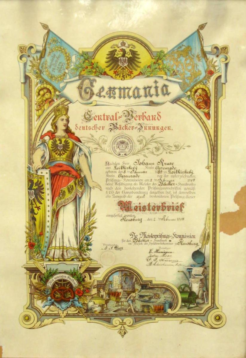 Bager mesterbrev, Løjt Kirkeby 1914 for bagermester Johan Kruse. Litografi. 66 x 48 cm. I mahogni ramme.