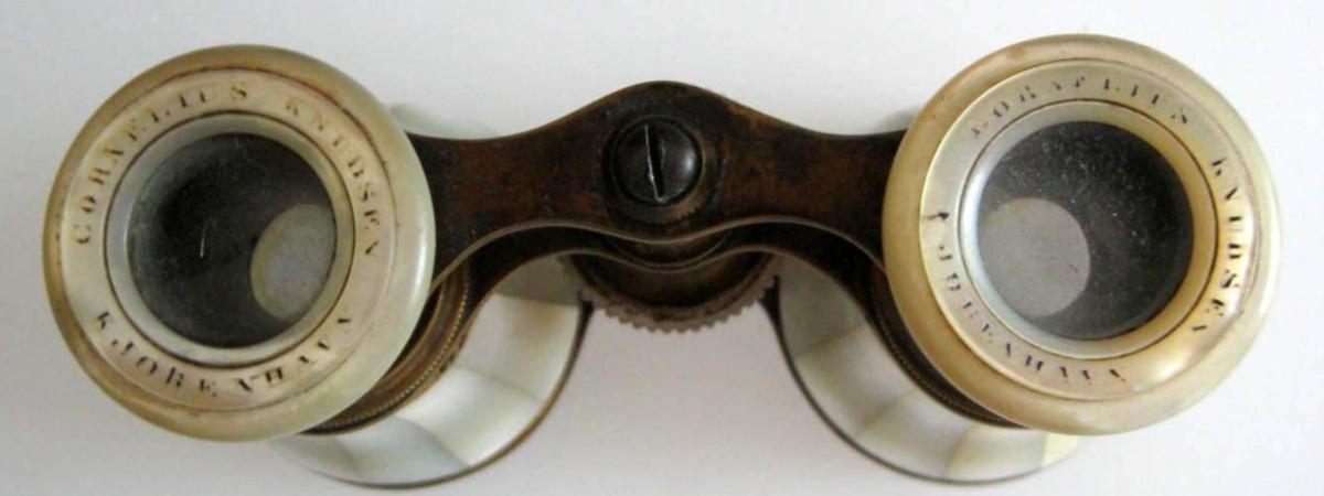 Teaterkikkert, 19. årh. Danmark, messing og perlemor. Signeret: Cornelius Knudsen, Kjøbenhavn. B.: 11 cm. L.: 7,5 cm.