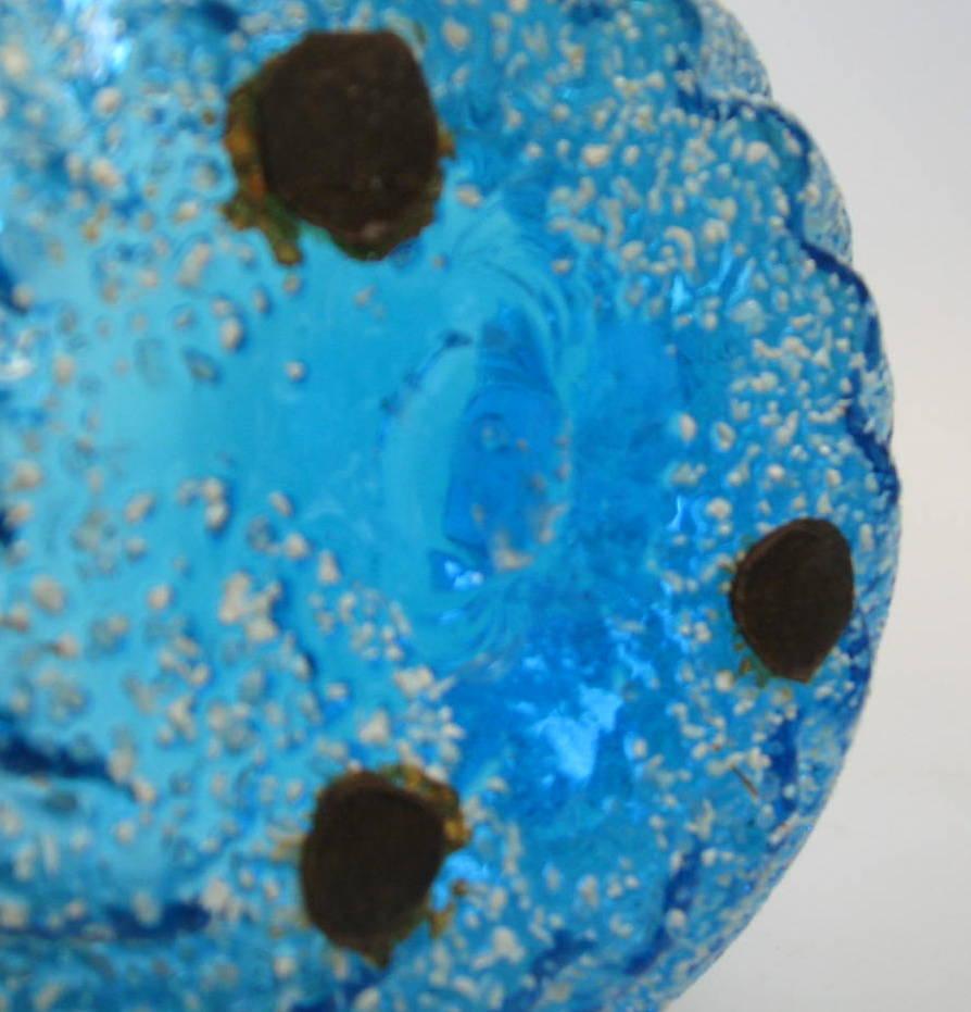 Glasskål med hank, i sø blåt glas, o. 1900 - antagelig Danmark. I det blå glas indlagtehvide prikker. Flæset kant og hank udformet som gren med knaster. H.: 16 cm. Dia.: 14,5 cm.